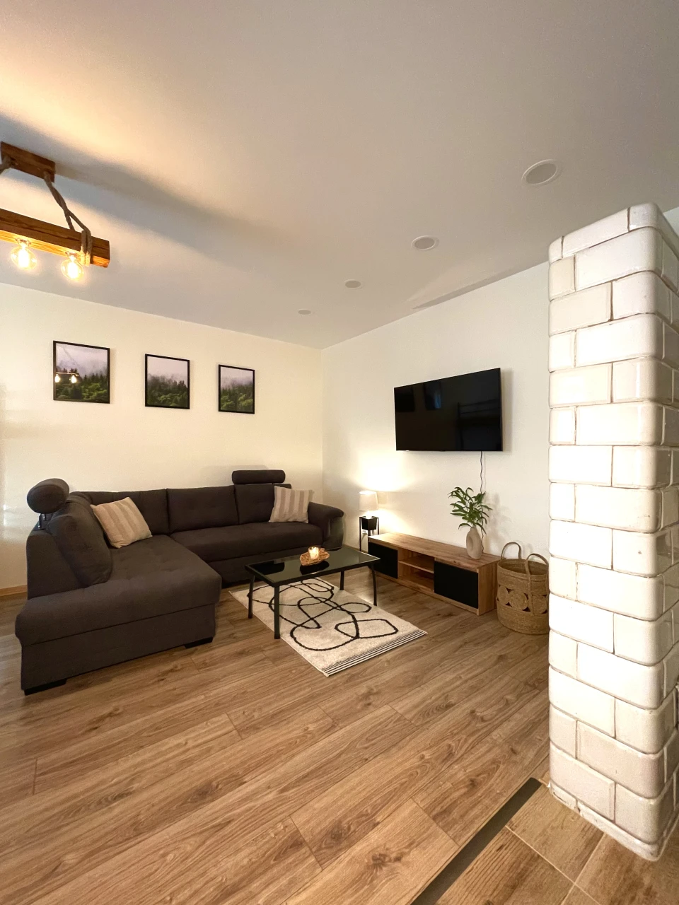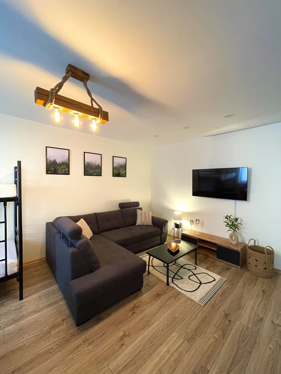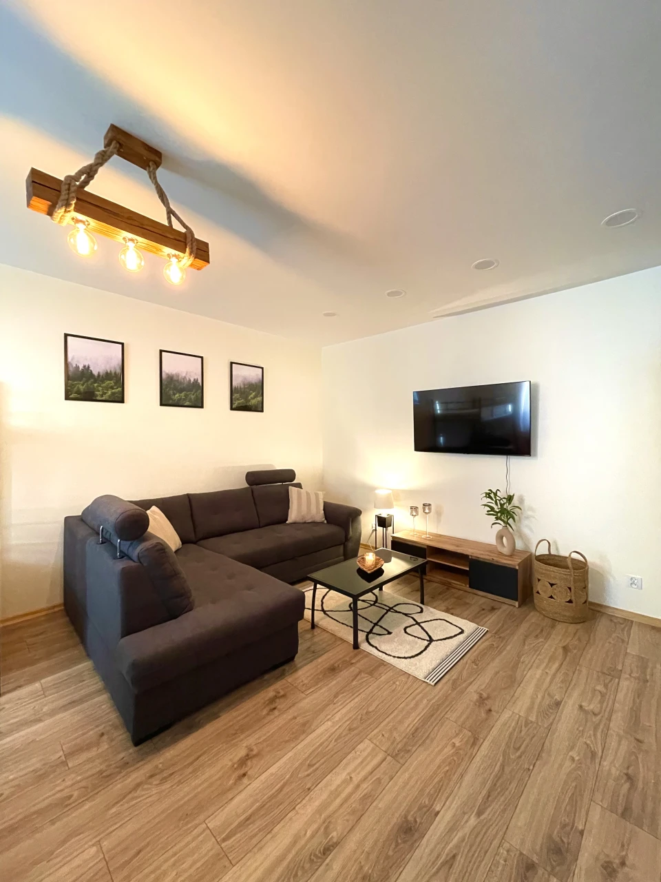 Wnętrza apartamentu zapewniają spokojną atmosferę, a panoramiczne okna otwierają widok na urokliwe tereny otaczające uzdrowisko.
