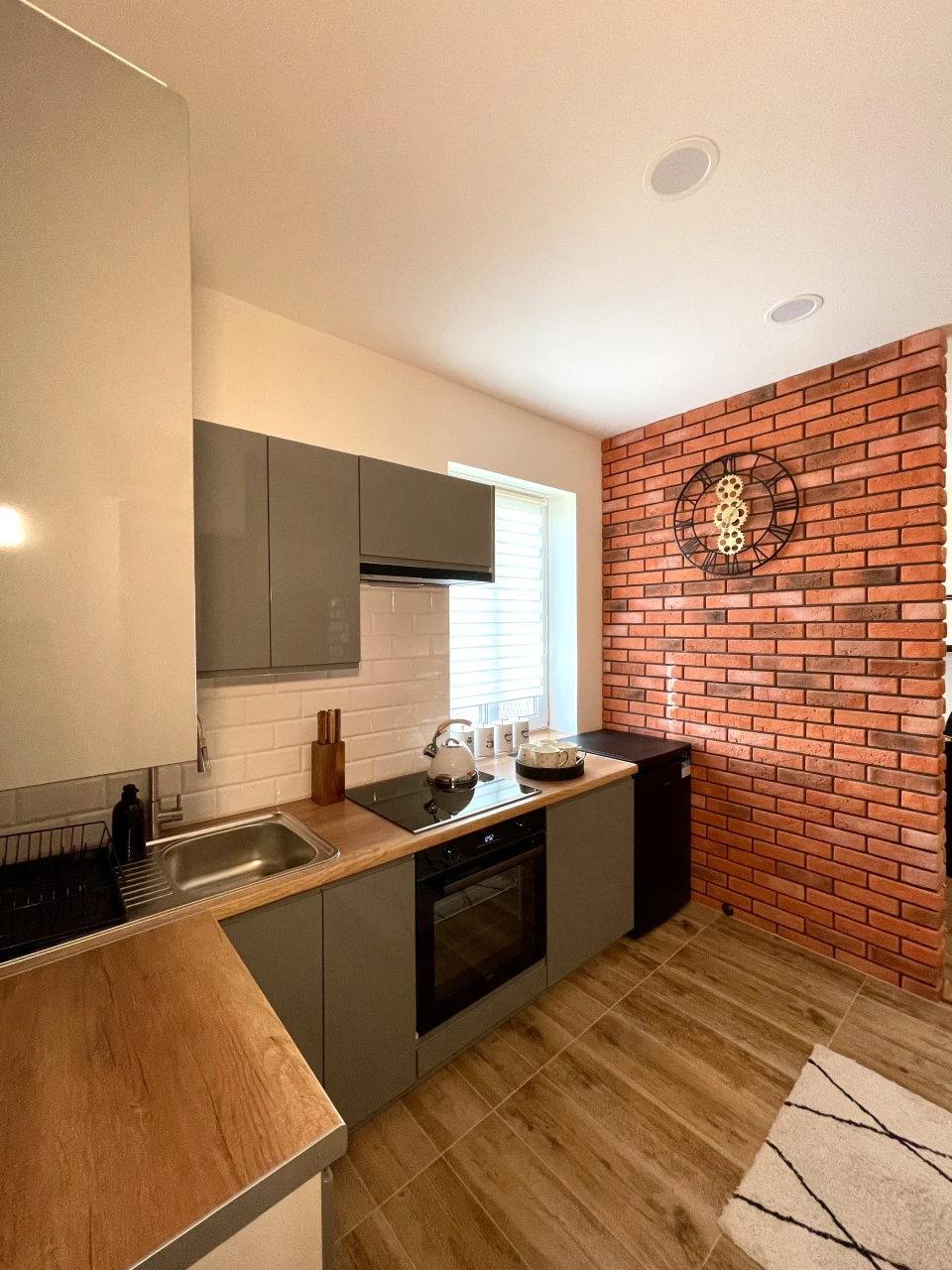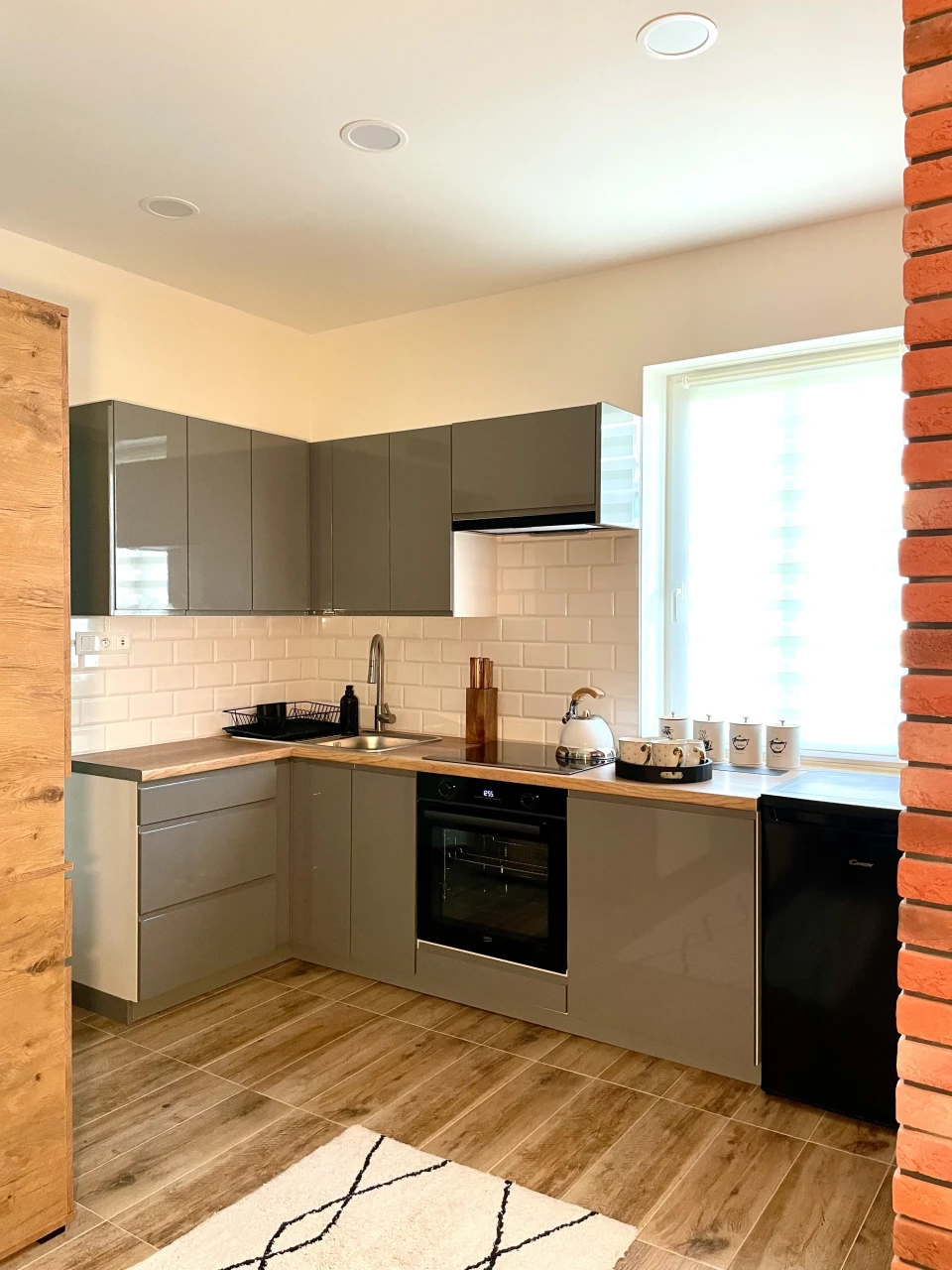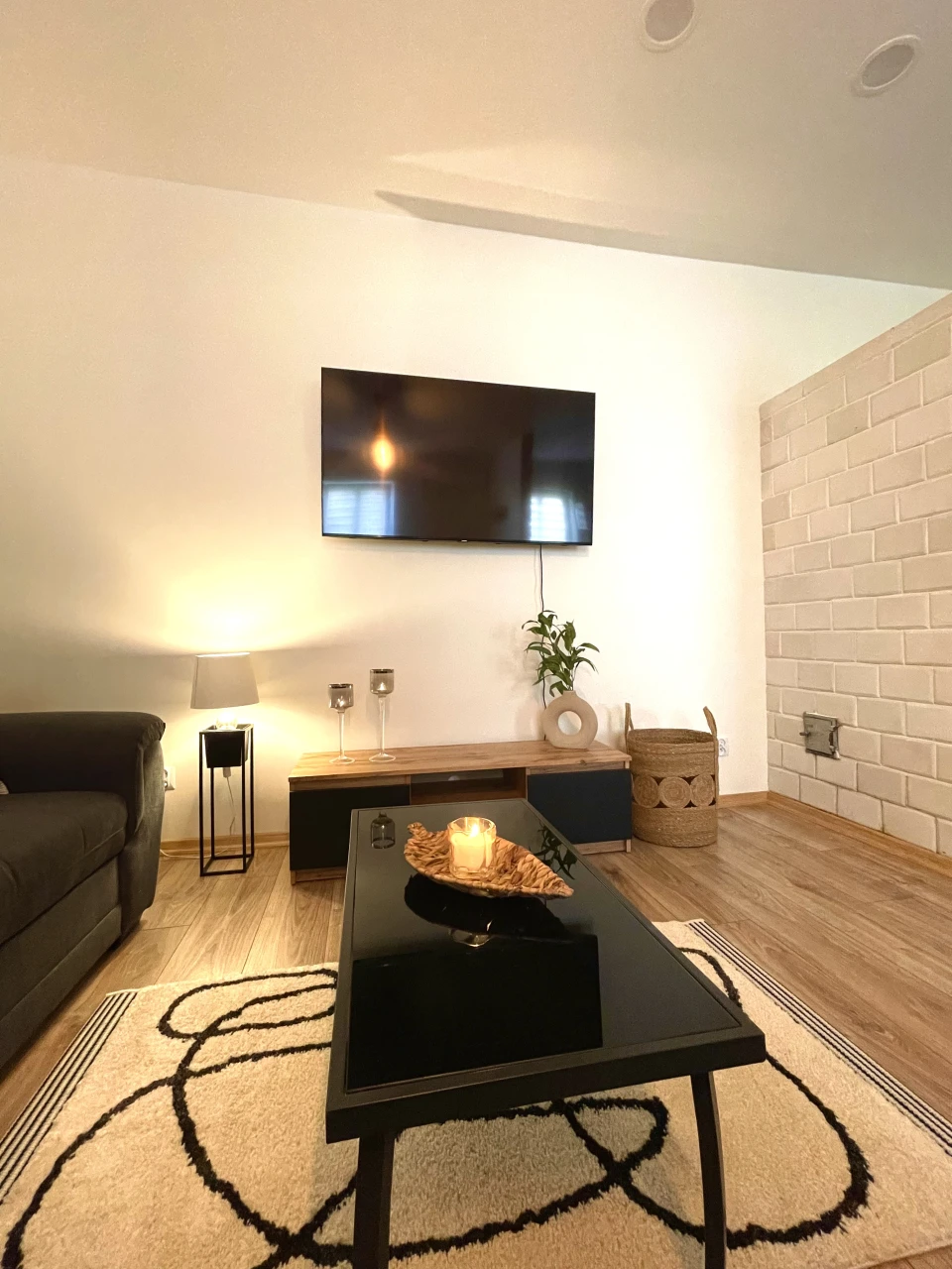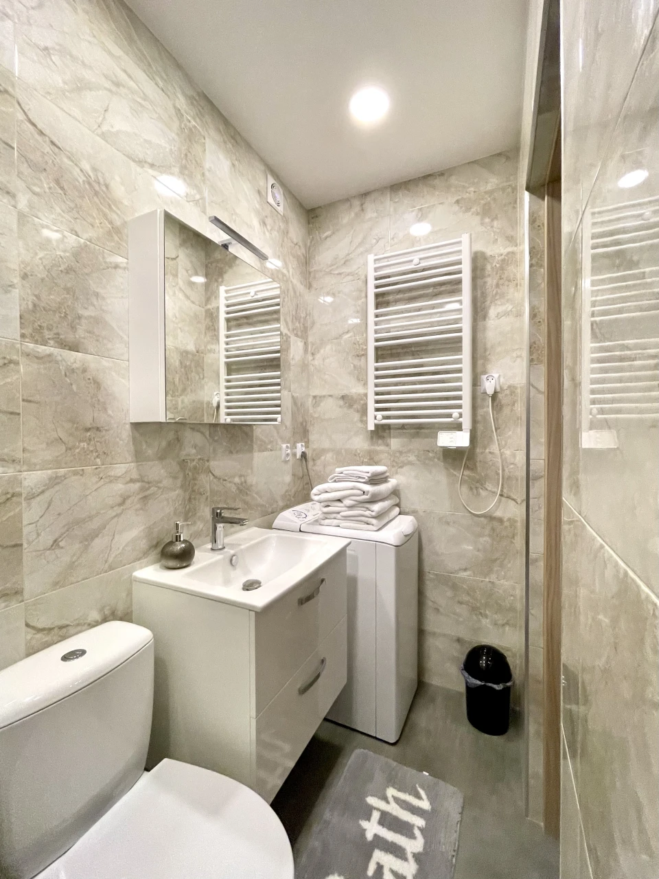 Wnętrza apartamentu zapewniają spokojną atmosferę, a panoramiczne okna otwierają widok na urokliwe tereny otaczające uzdrowisko.